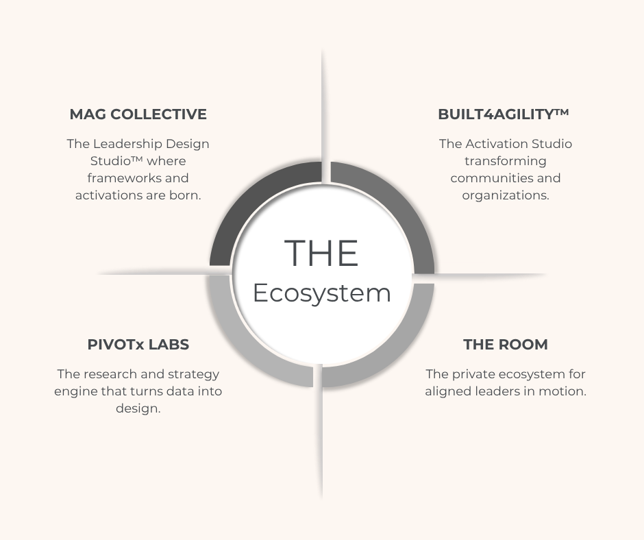 Through Built4Agility™, The Room, and Pivotx Labs, we design connected spaces for learning, leadership, and lived experience — where reflection becomes action and alignment becomes movement.